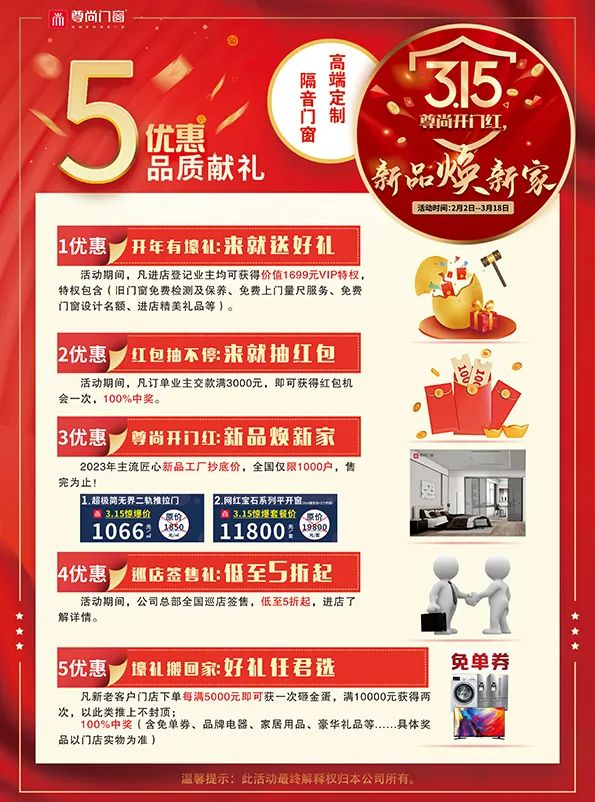 活动期间,凡进店登记业主都将获得价值1699元VIP特权,特权包含(旧门窗免费检测及保养、免费上门量尺服务、免费门窗设计名额、进店精美礼品等)